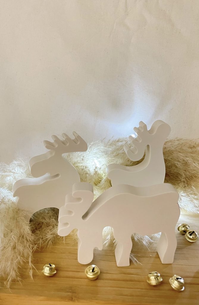 Tres Renos traviesos listos para acompañar la magia de la Navidad. Un detalle encantador que llena el hogar de alegría y espíritu festivo.